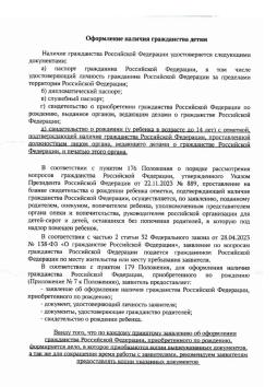 В целях информирования граждан (родителей, законных представителей), представляем вашему вниманию информацию об оформлении наличия гражданства Российской Федерации детям.