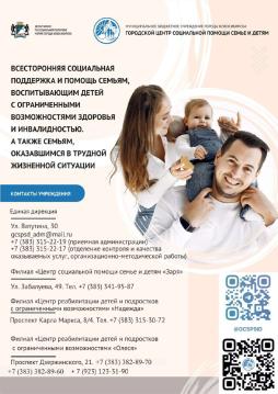 «Городской центр социальной помощи семье и детям» предоставляет комплекс реабилитационных услуг семьям, воспитывающим детей с ограниченными возможностями здоровья и инвалидностью в возрасте от 0 до 18 лет на безвозмездной основе на базе трех филиалов.